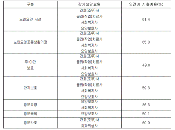 장기요양기관의 장은 재가 및 시설 급여비용 청구 및 지급에 따라 급여유형별로 지급받은 장기요양급여비용 중 다음 표에 명시된 비율(이하 ‘인건비 지출비율’이라 한다)에 따라 그 일부를 장기요양요원에 대한 인건비로 지출하여야 한다.