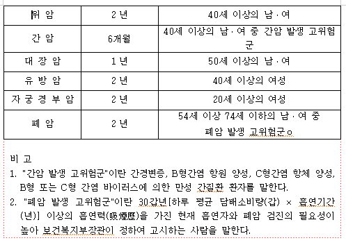 (참고사항) 암의 종류별 검진주기와 연령 기준 등(암관리법 제8조 2항)