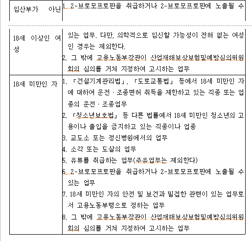 사용자는 여성과 18세 미만인 사람을 갱내(坑內)에서 근로시키지 못한다. 다만, 보건ㆍ의료, 보도ㆍ취재 등 *대통령령으로 정하는 업무를 수행하기 위하여 일시적으로 필요한 경우에는 그러하지 아니하다.