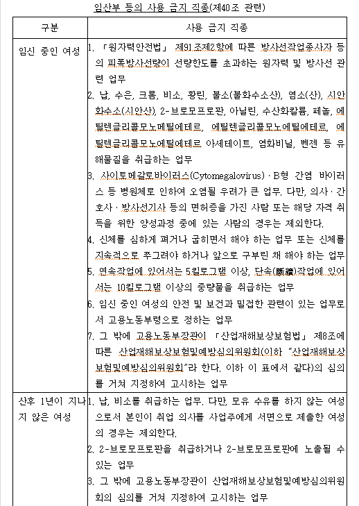 임산부, 임산부가 아닌 18세 이상인 여성 및 18세 미만인 자의 사용이 금지되는 직종의 범위는 별표 4와 같다.