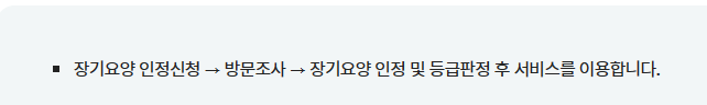 - 방문목욕 : 장기요양요원이 목욕설비를 갖춘 장비를 이용하여 수급자의 가정 등을 방문하여 목욕 지원