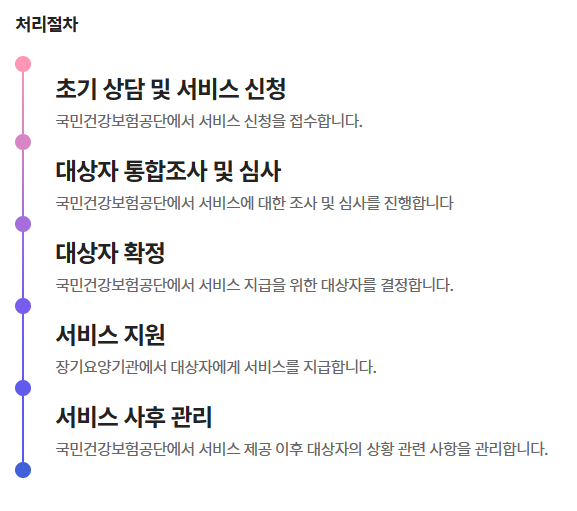 장기요양 인정신청 → 방문조사 → 등급판정 후 서비서를 이용합니다.