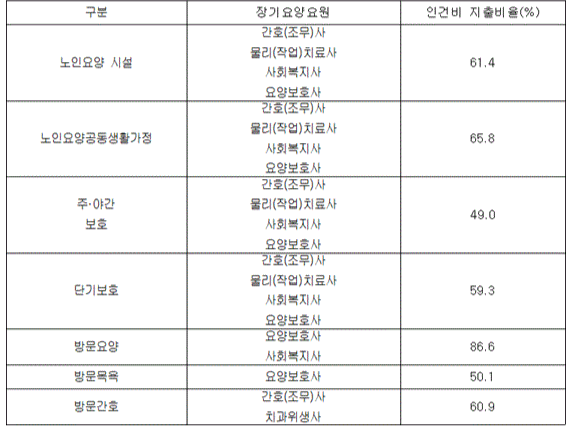 장기요양기관의 장은 급여유형별로 지급받은 장기요양급여비용 중 다음 표에 명시된 비율(이하 ‘인건비 지출비율’이라 한다)에 따라 그 일부를 장기요양요원에 대한 인건비로 지출하여야 한다.