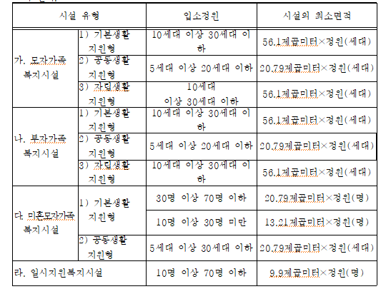 - 모자 · 부자가족복지시설 중 기본생활지원형 및 자립생활지원형의 거실에는 부엌을 포함하되, 거실의 실제면적은 세대당 42.9제곱미터 이상이어야 한다