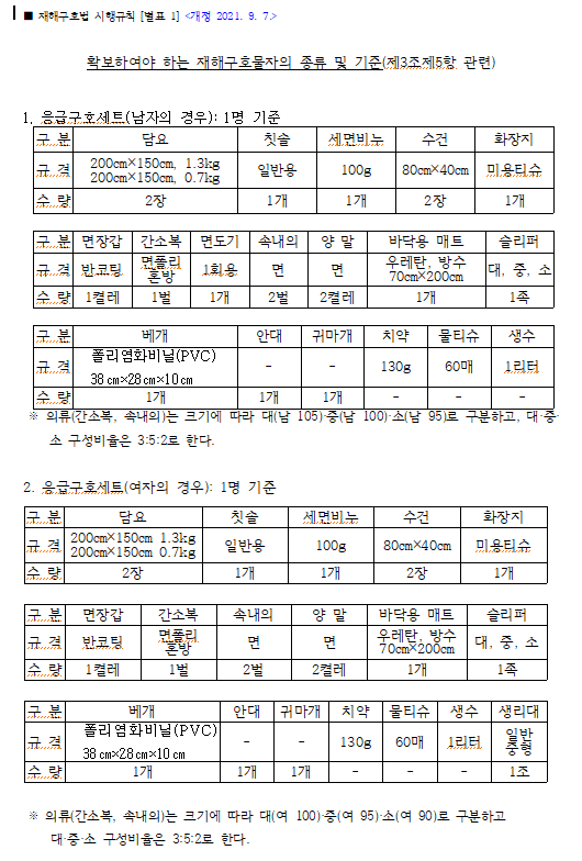 ○구호기관이 제 확보하여야 하는 재해구호물자의 종류 및 기준