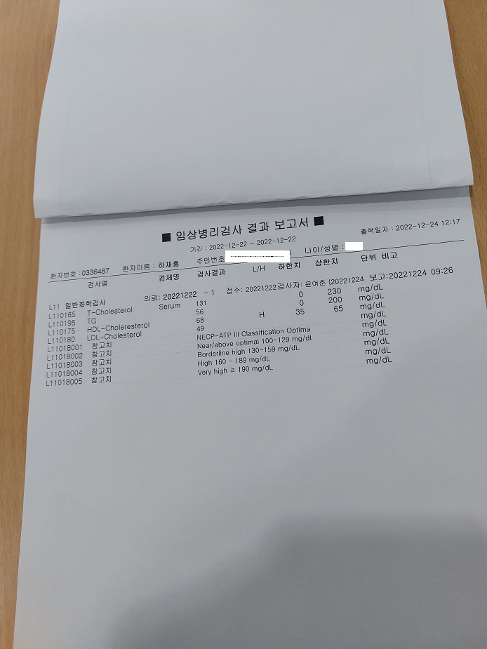 그래서 12월 24일 콜레스테롤과 중성지방 검사를 하였다. 다행히 정상인보다 더 정상적으로 나왔다.